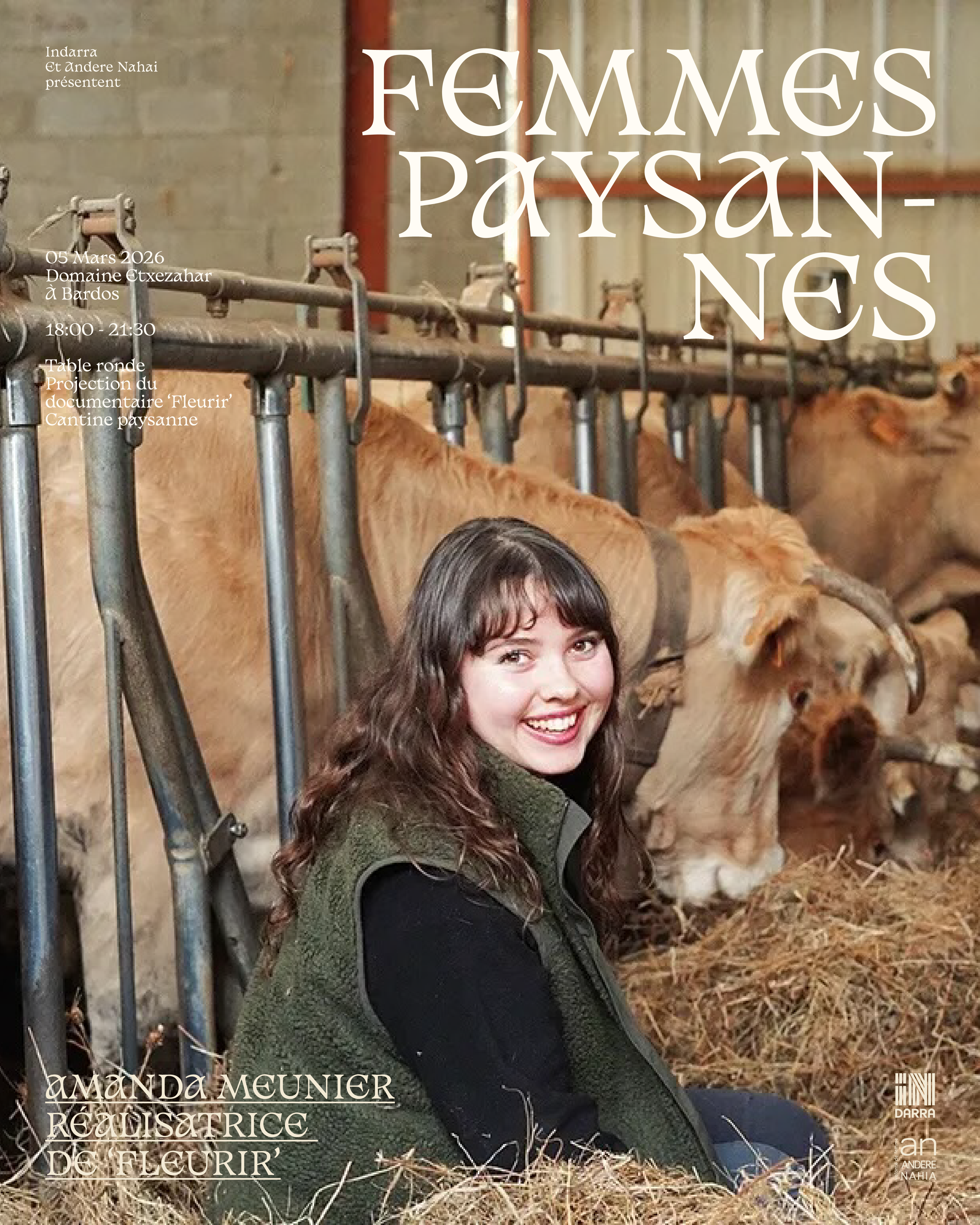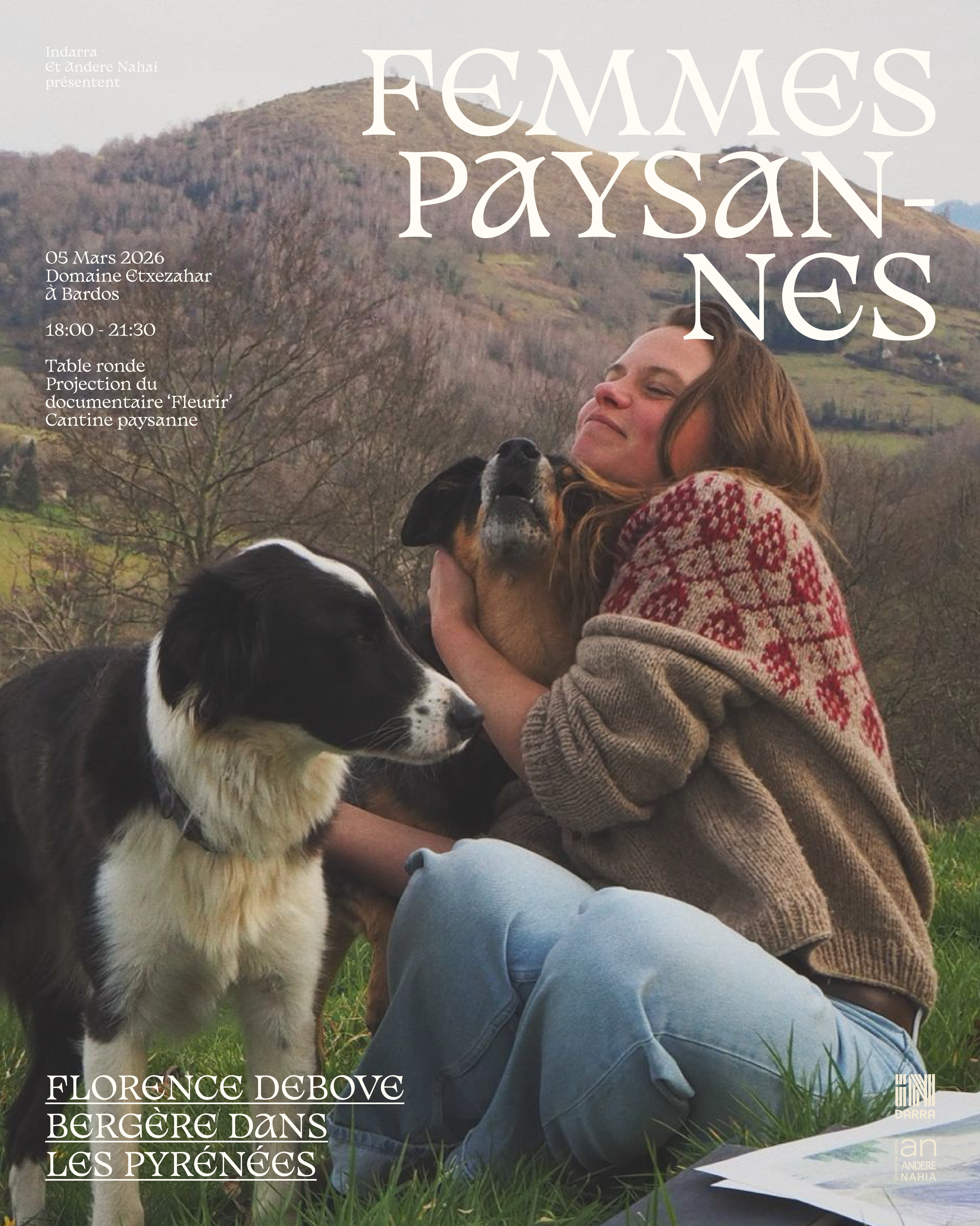 Dans le cadre de l’événement Femmes Paysannes, organisé par le Fonds de dotation Indarra en collaboration avec @andere_nahia, une soirée de rencontres et d’échanges se tiendra le 5 mars à Bardos, à l’occasion de la Journée internationale des droits des femmes.